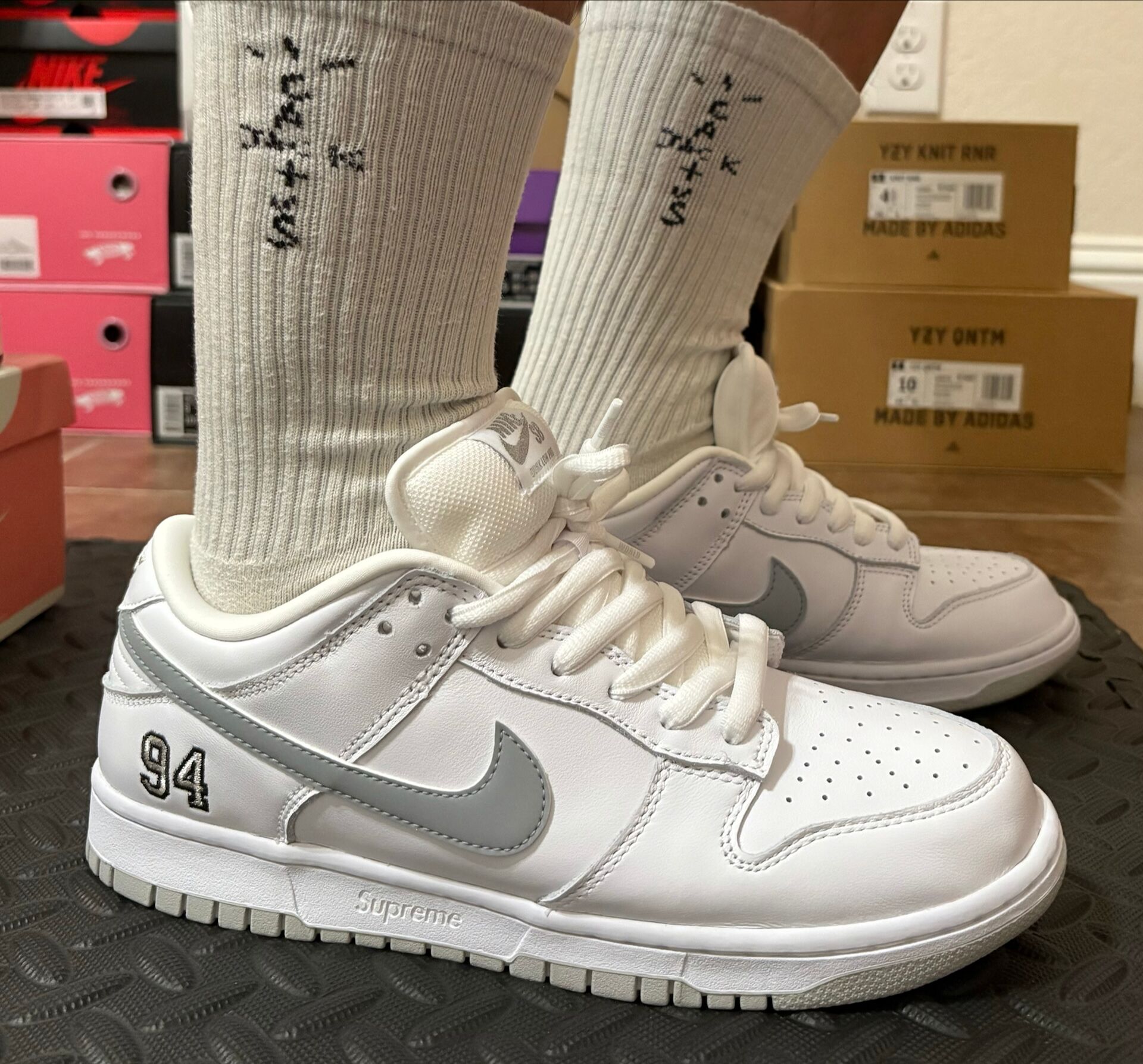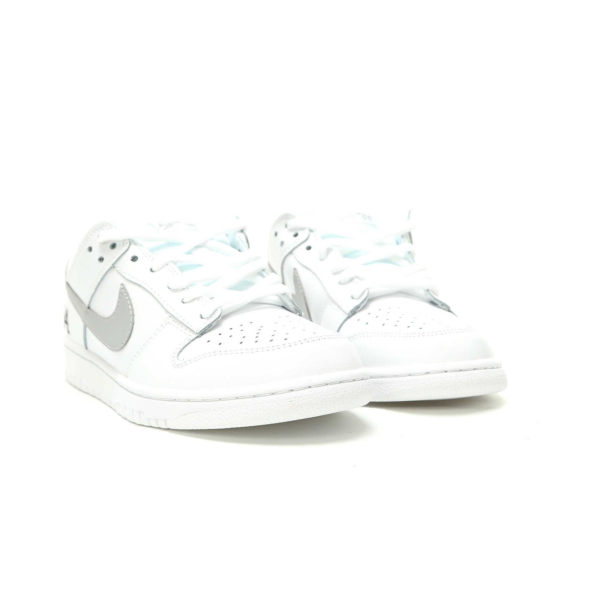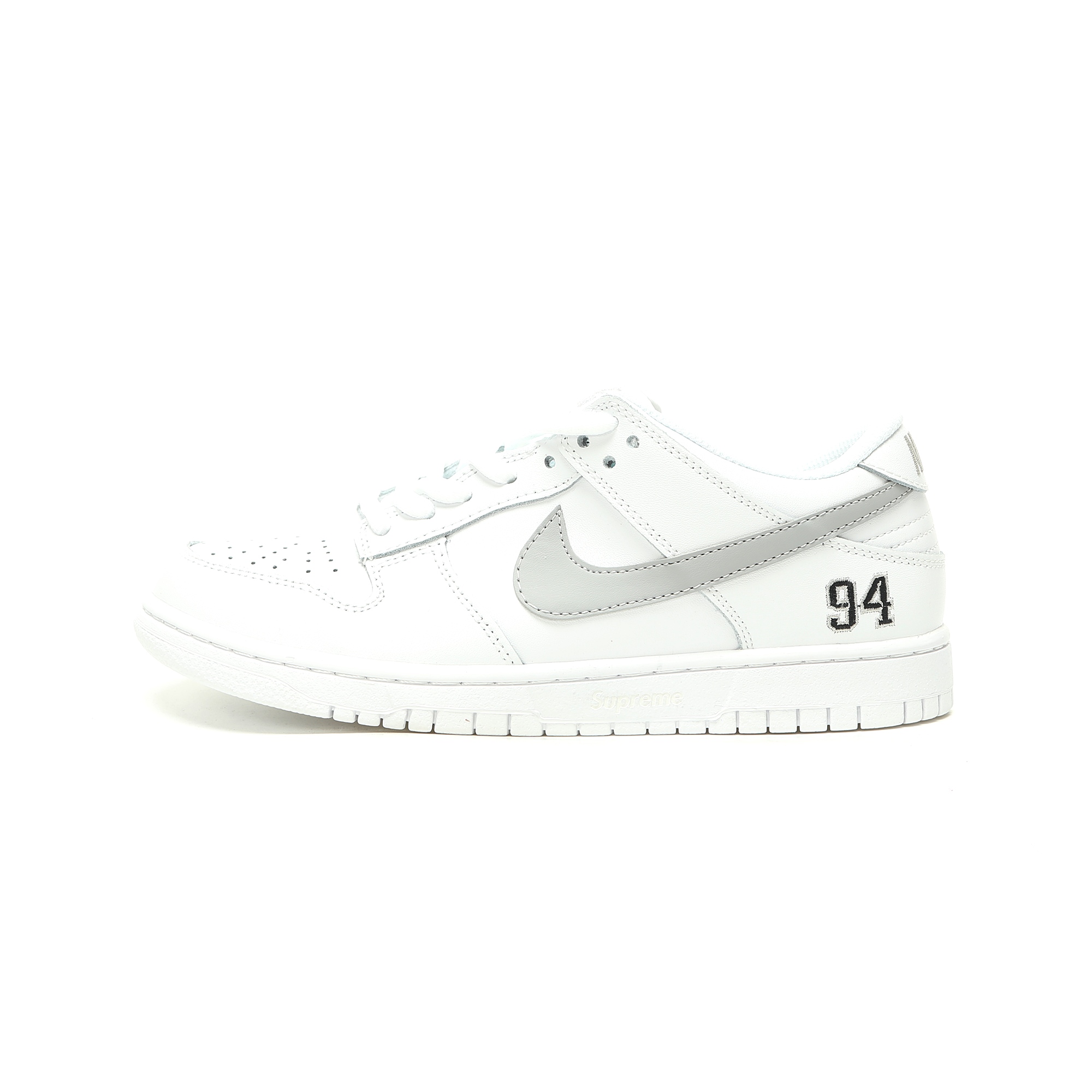 Experience the iconic collaboration between Supreme and Nike with the SB Dunk Low Retro in a clean White Gray colorway. Designed for both men and women, these skate shoes combine Supreme's streetwear aesthetic with Nike's performance heritage. Featuring premium leather construction and the classic Dunk Low silhouette, they deliver style and functionality for skateboarding and everyday wear.