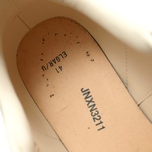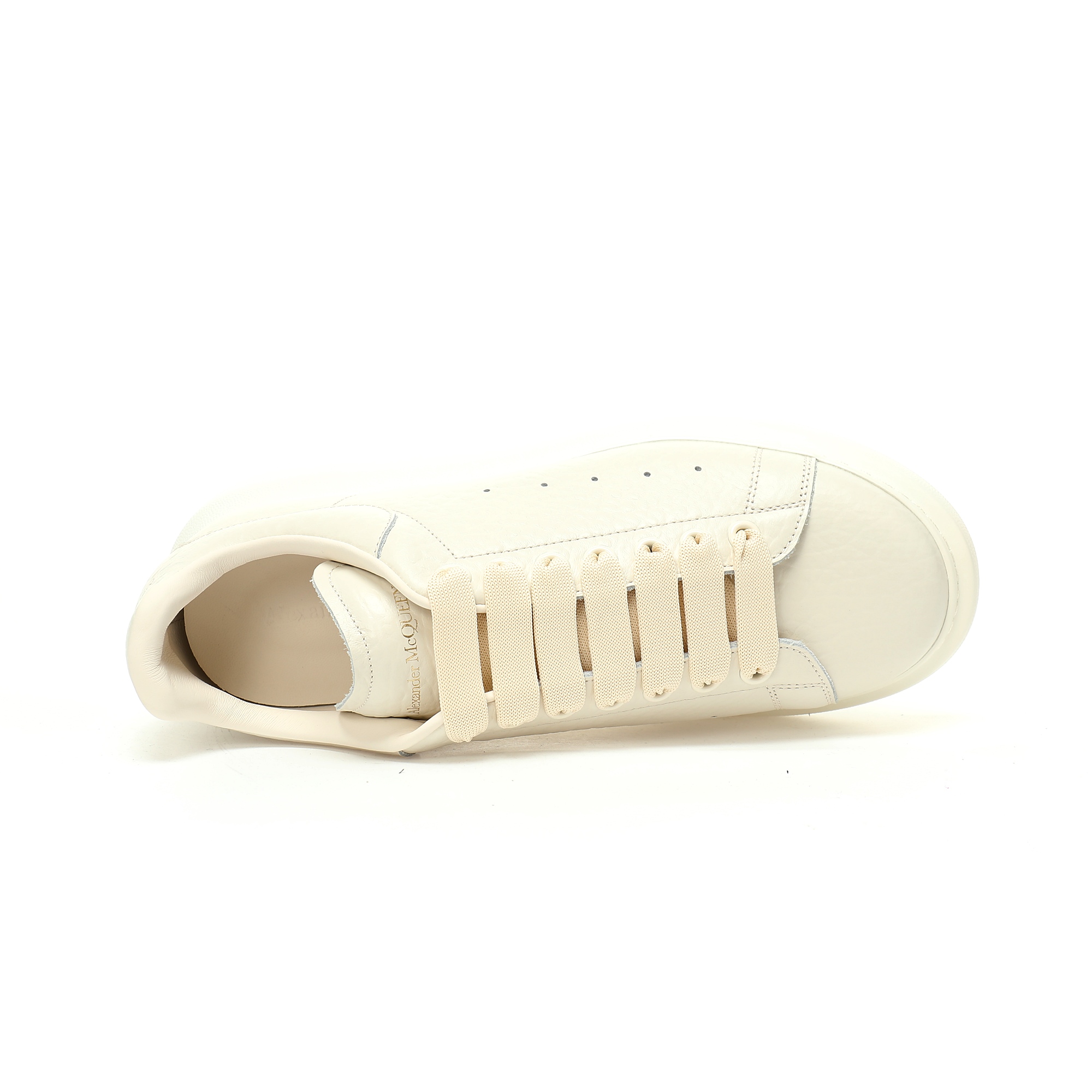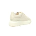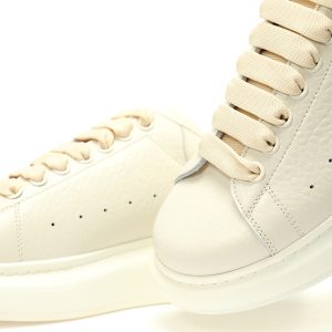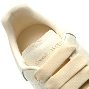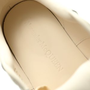 White smooth calf leather lace up sneakers with round toe design and white leather details on the heel. Paired with wide flat shoelaces, the tongue and back are adorned with the Alexander McQueen brand logo. Wide rubber sole.