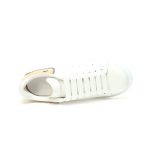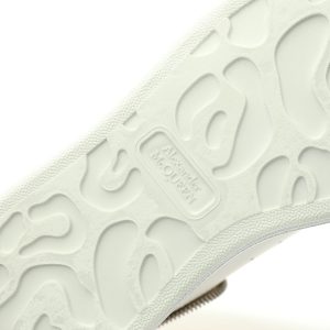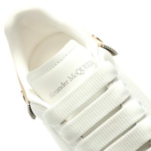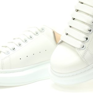 White smooth calf leather lace up sneakers with round toe design and white leather details on the heel. Paired with wide flat shoelaces, the tongue and back are adorned with the Alexander McQueen brand logo. Wide rubber sole.