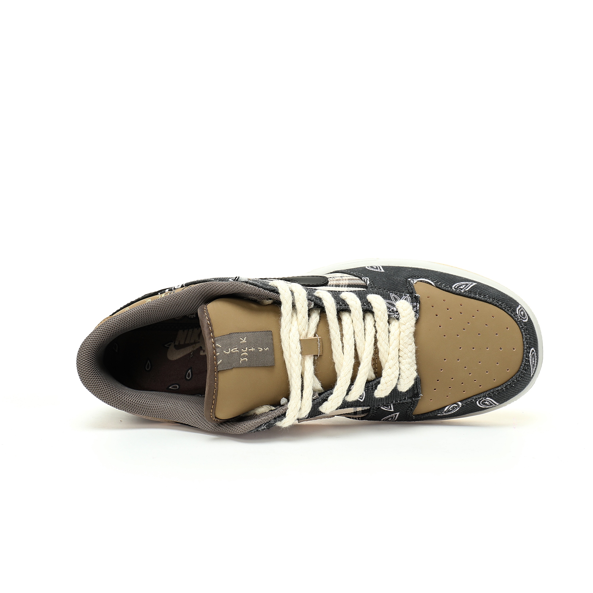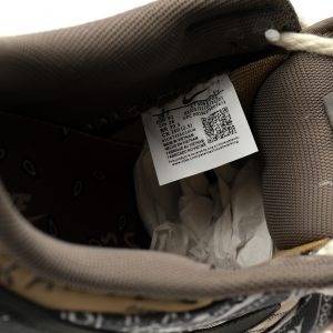 The highlight of the shoe body is that the cashew flower part of the upper is a tear upper design, which reveals the same dead tree texture of Travis Scott x Air Force 1. The top shoelaces are embellished with a buckle next to the hole. This small detail is often extra pinked. The shoelaces are decorated with white twine, which shows Travis Scott's cowboy temperament.