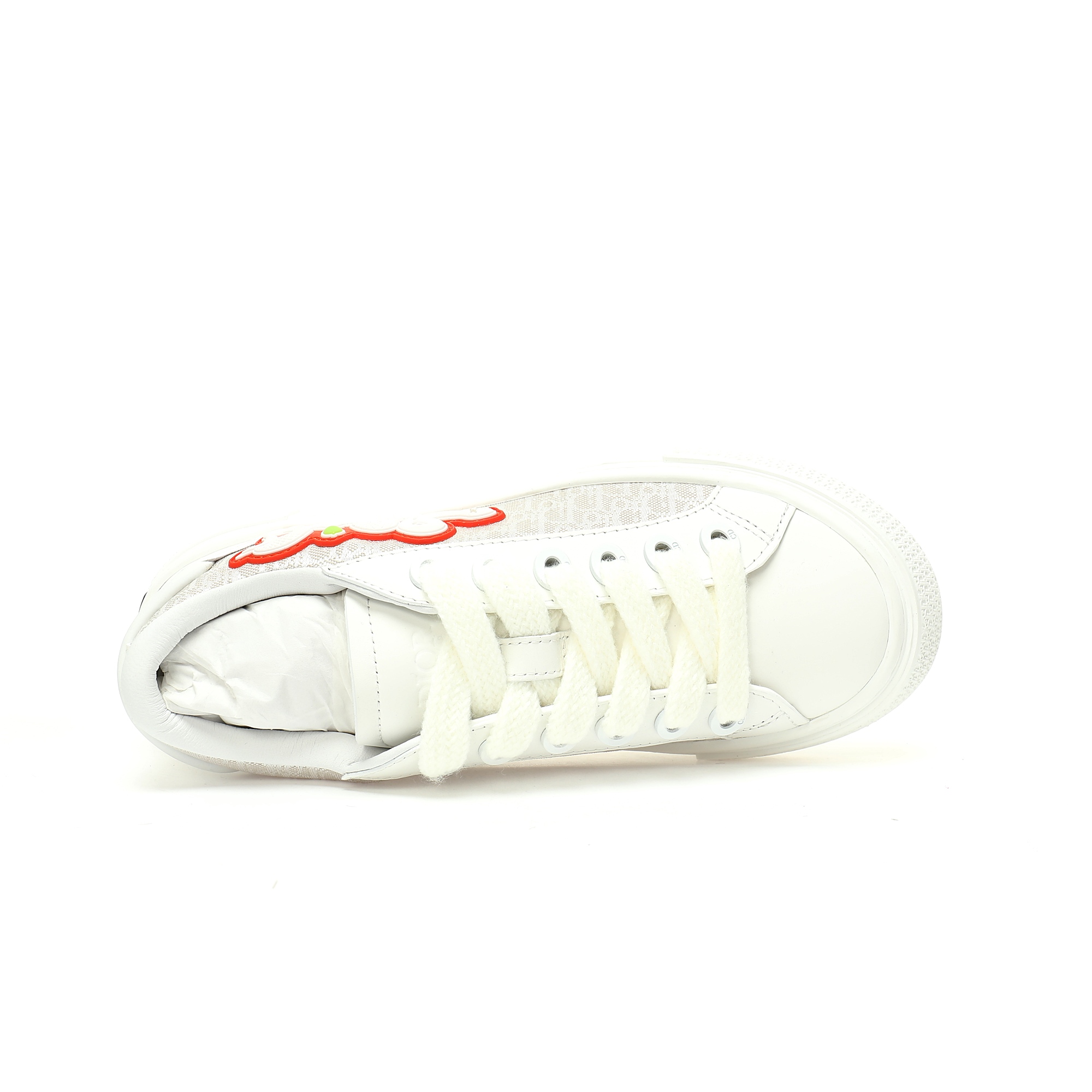 Lining material: cow leather, Mesh fabric Tricolor DIOR AND KAWS rubber patches tongue with Dior embossed logo Heel with Dior 30 Avenue Montaigne logo Low top mohair shoelace open AND close padded collar with DIOR AND KAWS logo inside sole The navy blue Oblique pattern rubber sole with a curved rattan pattern and the Oblique pattern outsole contain a dust bag that comes with a pair of navy blue cotton shoelaces