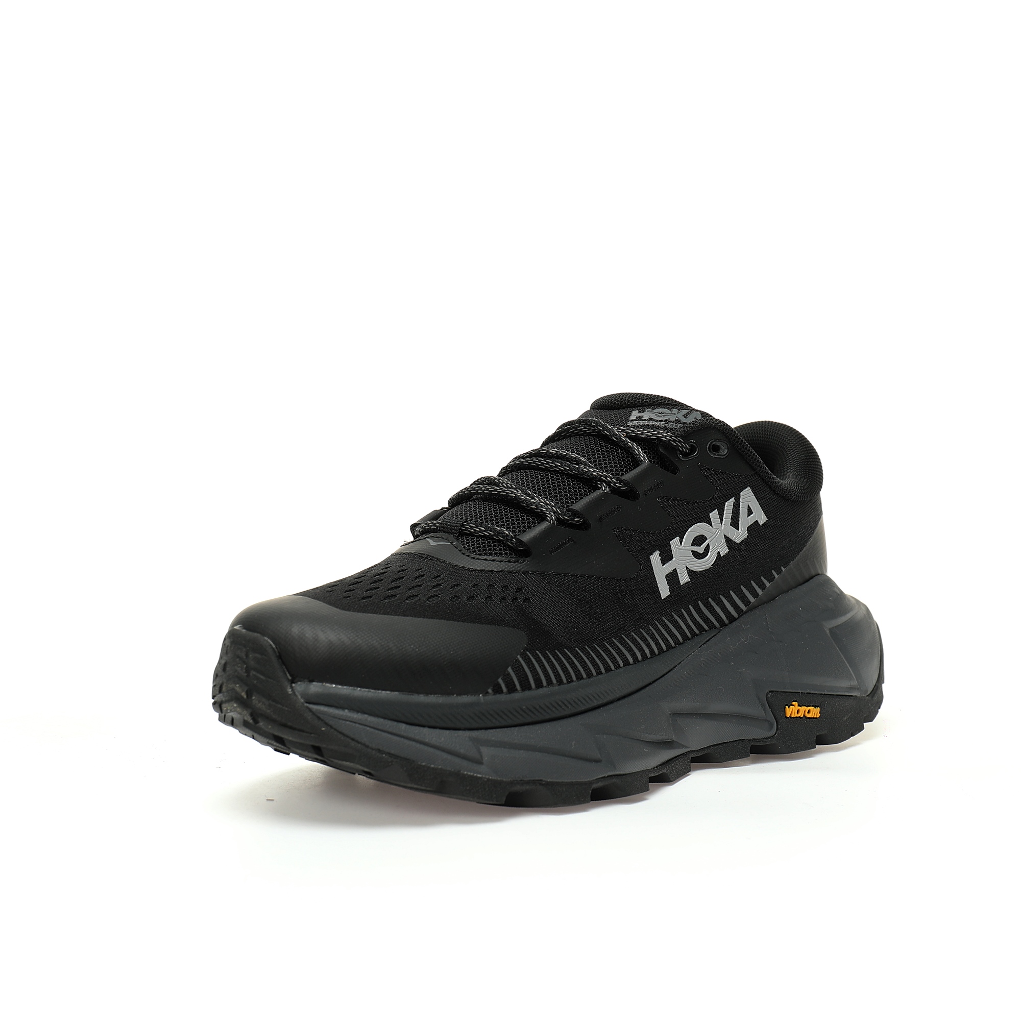 HOKA ONE Skyline Float X, an emerging running shoe brand in the United States, is a low cut, thick soled, ultra light mountain climbing, shock-absorbing, and casual sports running shoe with a mesh woven all black gray color. It is 1141610/BBLC