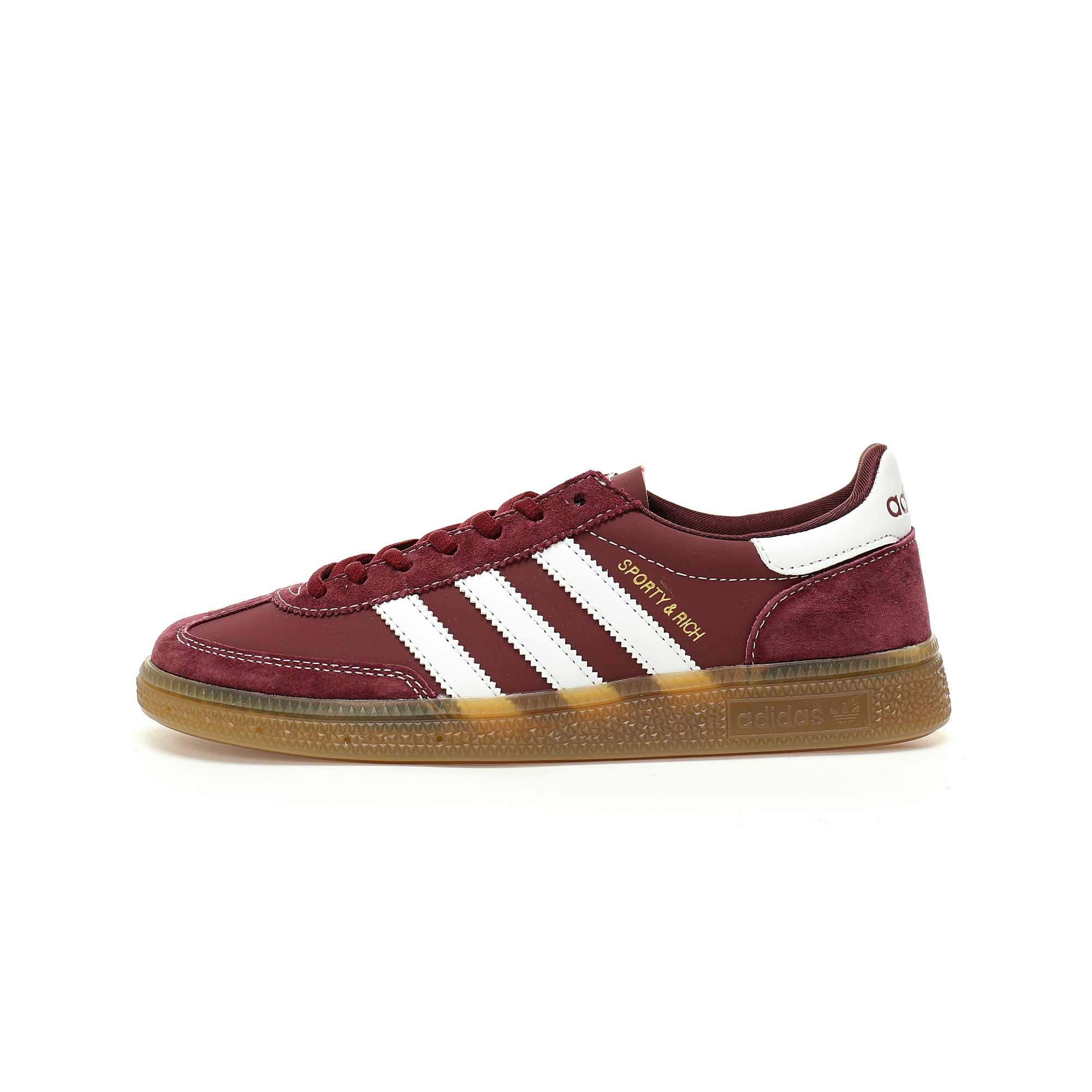 In the spring and summer of 2025, Sporty & Rich once again joined hands with adidas to create Handball Spezial series shoes. The collaboration recreates the iconic Handball Spezial silhouette, made of premium suede, with white accents on the LACES, tongue tags, heel panels, signature triple stripes and stitching, The gold leaf "Sporty & Rich" on the middle foot replaces the standard "Handball Spezial", and the translucent rubber outsole adds to the overall look, emitting a retro charm.