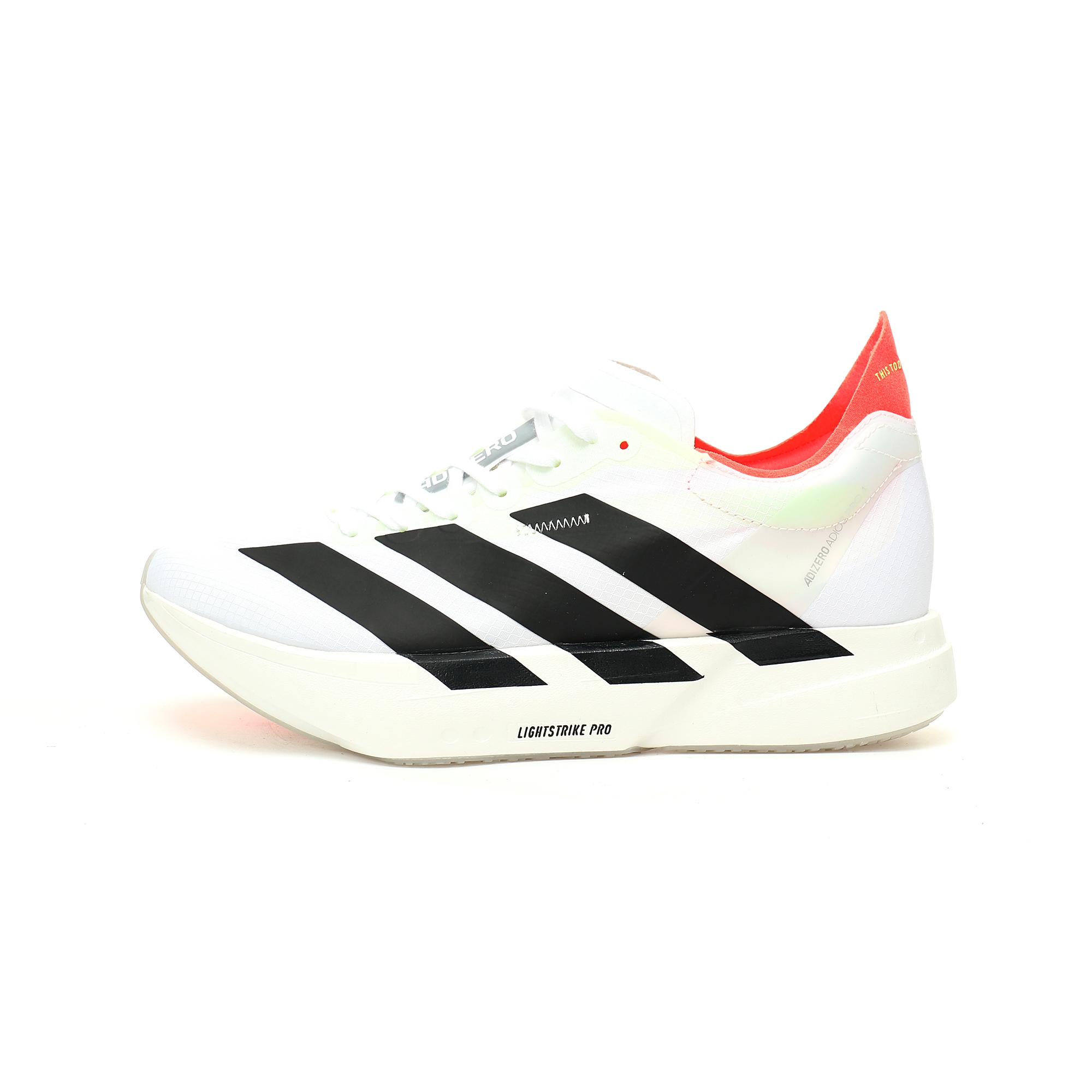 The Adizero Adios Pro 4 takes its exterior design from the Adios Pro Evo 1. This improvement is not only a visual change, but more importantly, a functional upgrade. The shoe's front ball geometry is adjusted to 60 percent of the length of the shoe, which provides better propulsion and stability during running. In addition, the upper is made of a new Lightlock material, which is lightweight, breathable and fits the foot shape, enhancing the runner's comfort and freedom. The Adizero Adios Pro 4 comes with full hand Lightstrike Pro foam and an embedded ENERGYRODS 2.0 carbon column. Lightstrike Pro is Adidas' latest midsole material, featuring a lightweight, high-rebound feature that provides sustained cushionation and energy feedback during running. The material's lightness makes the Adizero Adios Pro 4 equally suitable for long-distance racing and training.