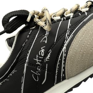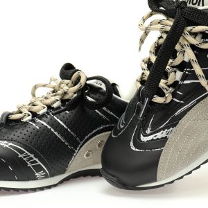 The heart is decorated with a printed logo inspired by the stage of footwear production, with beige suede cow leather inserts and double LACES. The side is decorated in the handwritten style of Christian
